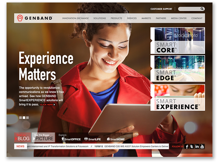 Literal pictures of server racks were failing to illustrate the promises of unified communications and a seamless user experience. Ignite deprioritized product shots and featured a more relatable, human aesthetic to aid overall branding efforts. With carefully curated imagery, Ignite was able to convey at a glance that GENBAND now focused on the user rather than just the hardware.